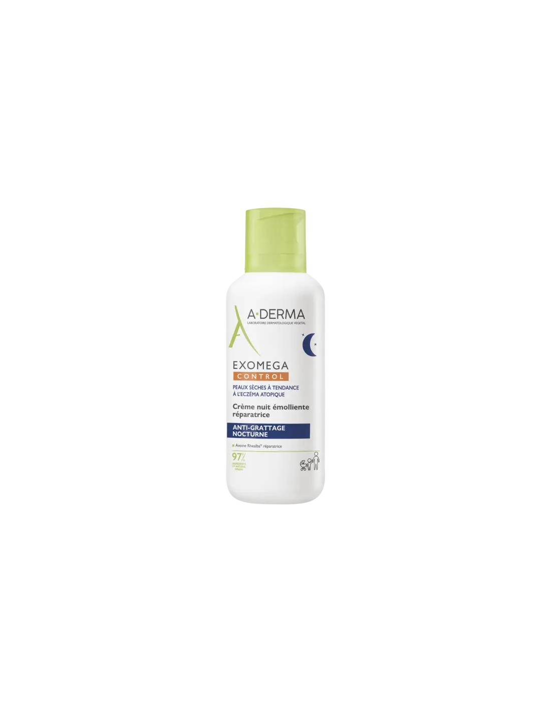 A-Derma Exomega Crema Noche** es un tratamiento emoliente de textura rica y nutritiva, diseñado específicamente para el cuidado de pieles secas, atópicas o muy sensibles. Proporciona hidratación intensa durante la noche, ayudando a calmar la irritación y reforzar la barrera cutánea. Ideal para bebés, niños y adultos.