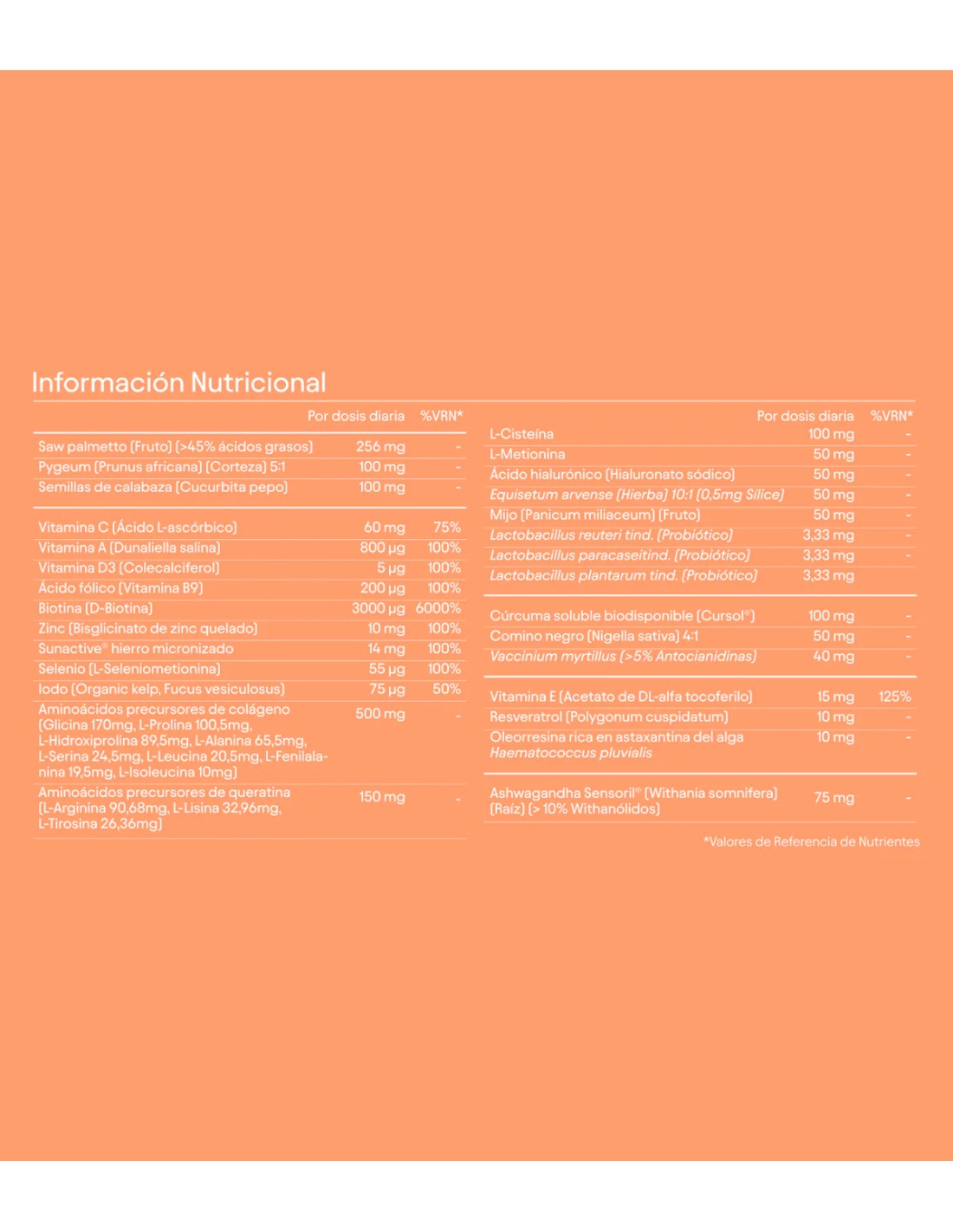 Agua, glicerina, fructosa de uva, precursores de colágeno (Glicina, L-Prolina, L-Hidroxiprolina, L-Leucina, L-Isoleucina, L-Fenilalaninia, L-Alanina y L-Serina), Saw Palmetto, Cursol* (Cúrcuma), precursores de queratina (L-Lisina, L-Arginina, L-Tirosina y L-Triptófano), Aromas, Whitania somnifera, Prunus africana, Semillas de Cucurbita pepo, L-Cisteína, vitamina C, bisglicinato de zinc, Fucus vesiculosus, celulosa microcristalina (estabilizante), Nigella sativa, ácido hialurónico, L-metionina, Glycyrrhiza glabra, Equisetum arvense, Panicum miliaceum, Sucroésteres de ácidos grasos (estabilizante), Vaccinium myrtillus, L-seleniometionina, vitamina E, citrato potásico (acidulante), ácido cítrico anhidro (acidulante), sorbato potásico (conservador), benzoato sódico (conservador), goma xantana (espesante), pirofosfato de hierro, Dunaliella salina, Astaxantina, Resveratrol, carboximetilcelulosa sódica (estabilizante), Lactobacillus reuteri, Lactobacillus paracasei, Lactobacillus plantarum, Biotina, ácido fólico, vitamina D3.