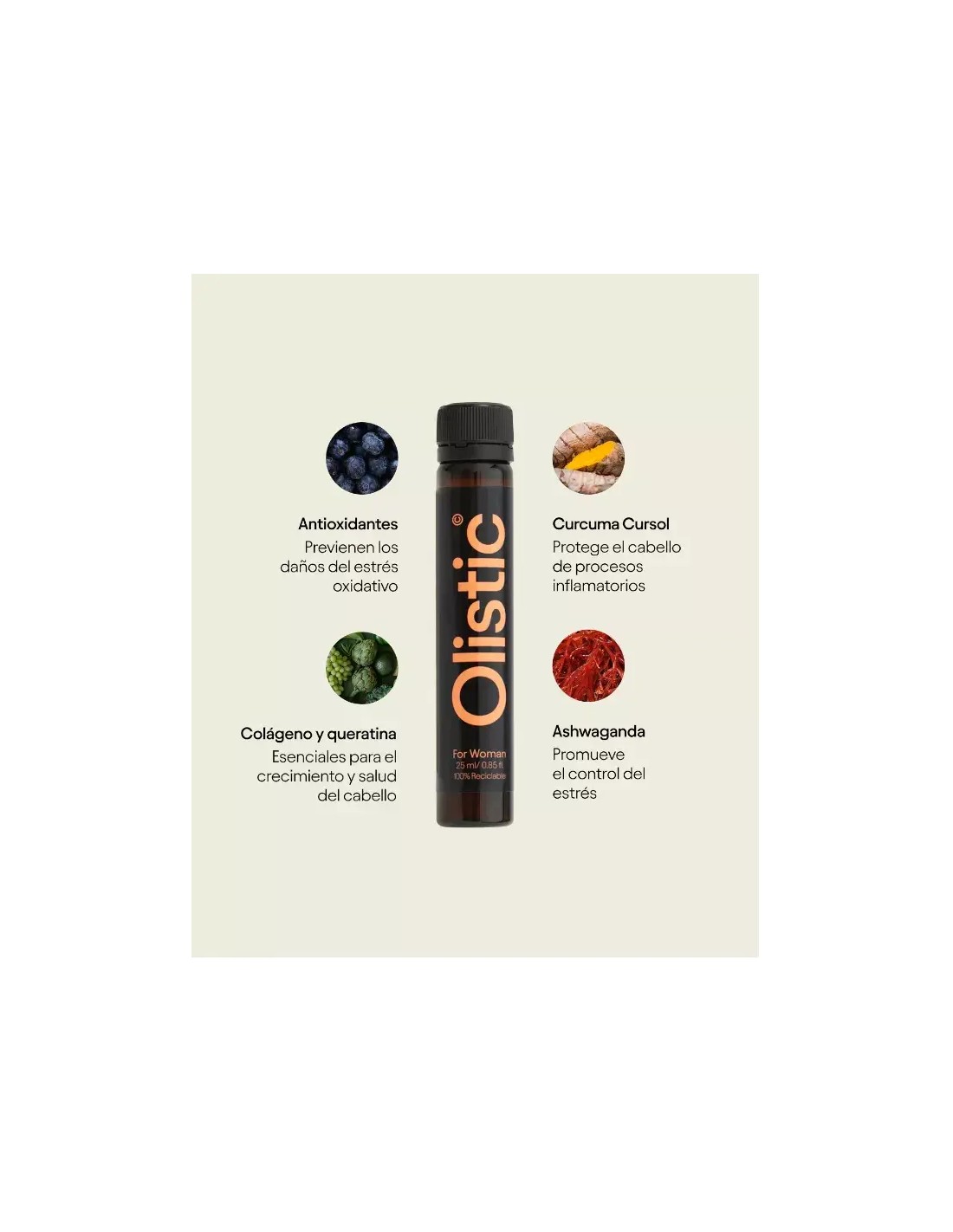 - Cada caja incluye 28 dosis de 25 ml cada vial. Olistic es un complemento alimenticio bebible diseñado para fortalecer, nutrir y combatir la caída del cabello femenino. Con una fórmula única compuesta por más de 30 ingredientes naturales y veganos, incluyendo vitaminas y minerales esenciales, así como más de 10 antioxidantes como resveratrol y astaxantina, aminoácidos de colágeno y queratina, cúrcuma, ashwagandha y otros productos naturales que ayudarán a mantener la salud de tu cabello en condiciones óptimas. Olistic es un producto vegano, no contiene gluten ni lactosa, y es libre de parabenos. Además, su sabor a mango y naranja añade un toque tropical para su consumo diario.