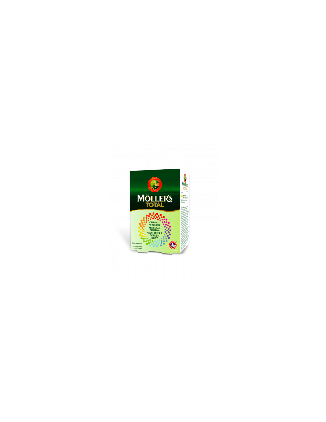 Möller's Total Multivitamínico + Omega-3 es un suplemento completo que combina una gama de vitaminas y minerales esenciales con Omega-3 (EPA y DHA) para apoyar la salud general del cuerpo, el cerebro, y el corazón. Este producto viene en un formato de 28 cápsulas de multivitamínicos y 28 perlas de Omega-3, proporcionando una solución integral para el bienestar diario.